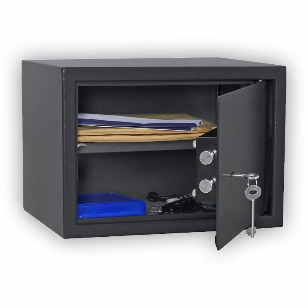 Stahlbüroschrank Müller Safe BN117/2 Der Müller Safe BN117/2 ist ein kompakter und robuster Stahlbüroschrank, der sowohl Einbruch- als auch Feuerschutz bietet. Mit Zertifizierungen nach EN14450 (S1), VDMA 24992 (A) und LFS 30P nach EN15659 erfüllt er wichtige Sicherheitsstandards. Er eignet sich ideal für die sichere Aufbewahrung von Dokumenten, Aktenordnern und Wertgegenständen in Büro oder Zuhause. [...]