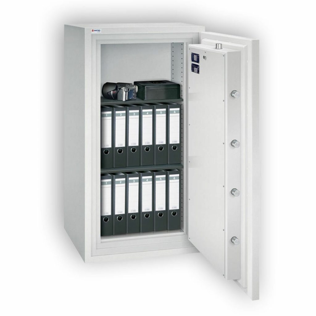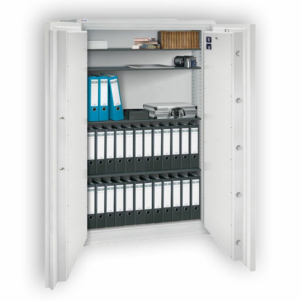 Wertschutztresor Müller Safe EN2-185 Dieser Wertschutzschrank, der in acht verschiedenen Größen verfügbar ist, überzeugt vor allem durch seine zertifizierten Sicherheitsstufe EN2, welche mit einer Feuerisolierung kombiniert wurde. Eine dreiseitige Bolzenverriegelung macht das Aufbrechen unmöglich und durch sein Gewicht kann dieser Tresor nicht abgetragen werden. In den verschiedenen Modellen finden fünf bis zu 52 Aktenordner Platz [...]