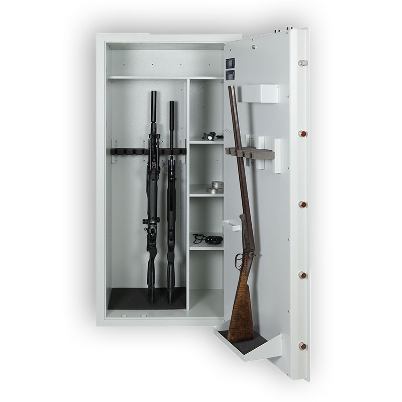 Standardmäßig ist der Waffenschrank mit einem Sicherheits-Doppelbartschloss inklusive zwei Schlüsseln ausgestattet. Optional kann der Tresor auch mit einem komfortablen Elektronikschloss gewählt werden, das eine schlüssellose Bedienung ermöglicht.